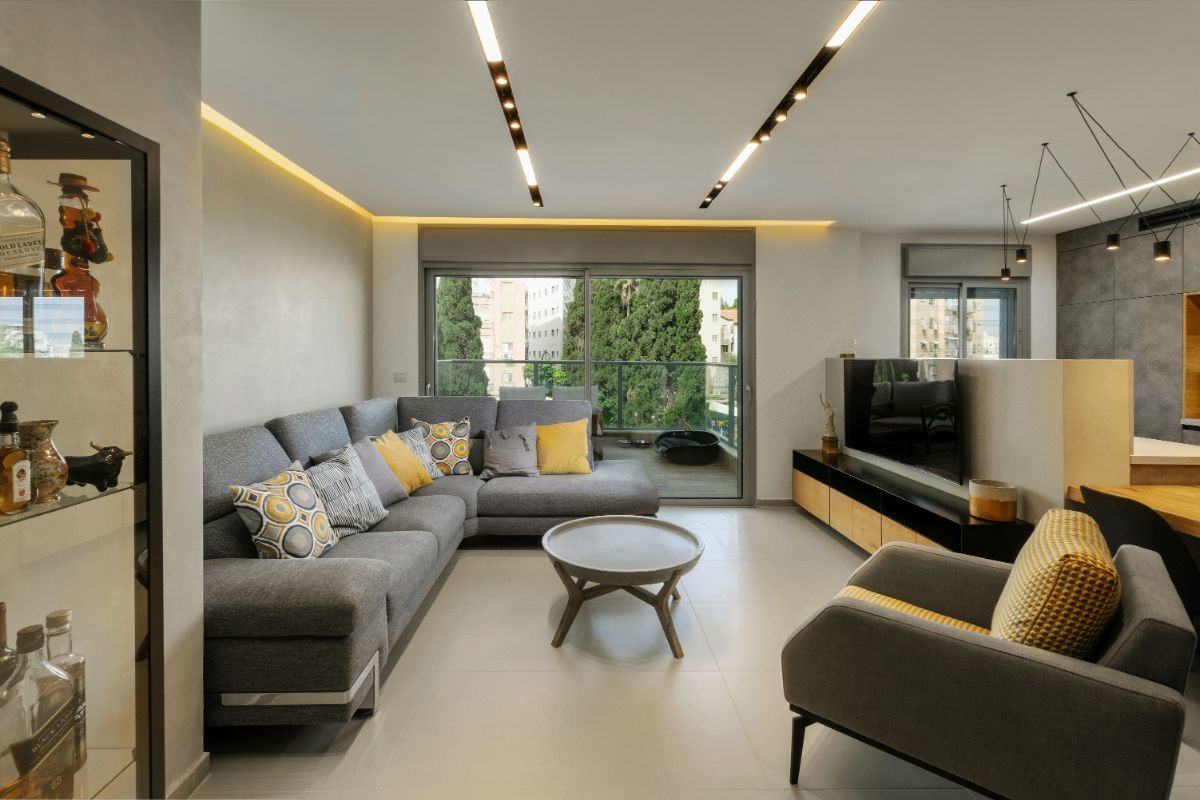 ואילו בהיבט העיצובי – בעוד האב העדיף סגנון כפרי, האם רצתה סגנון מודרני והזוג הצעיר רצה סגנון אולטרה מודרני, לי היה חשוב למצוא את המכנה המשותף שיגשר בין כל הטעמים והרצונות. בהמשך לכך עיצבתי לבני הזוג הצעיר מקל בצבע שחור שענה על הרצון בקו מודרני, ואילו החלל המרכזי עוצב בסגנון מודרני שכלל סלון אפור ותאורה שחורה, עם נגיעות חמות של שילובי עץ, גווני חרדל וזהב, וקיר כוח מאריחים, שנתנו לחדר רמזים של מגע יותר כפרי.