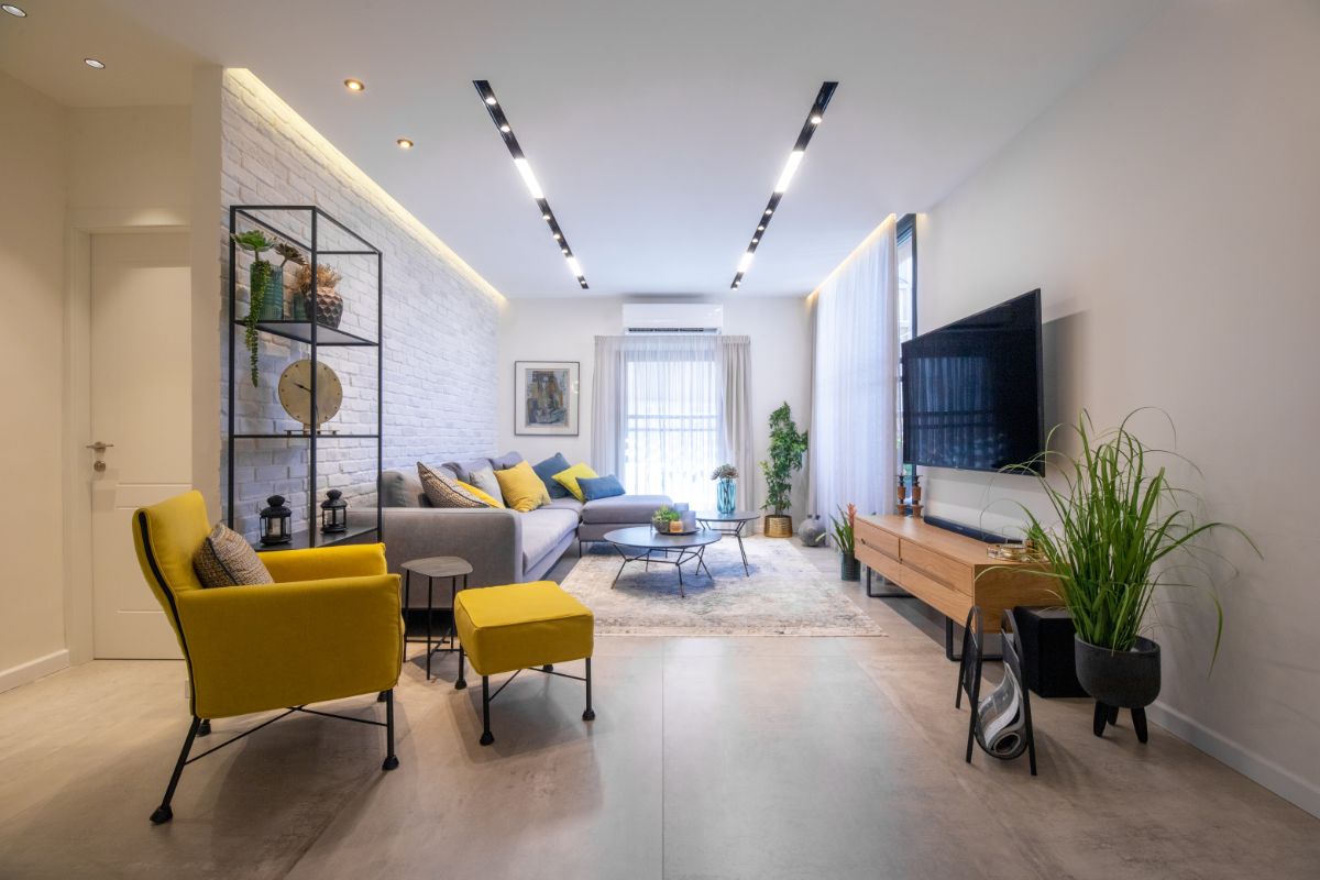 בפן העיצובי, הלקוחה ביקשה סגנון מודרני אבל חם, וכחלק מכך, נבחר ריצוף אפור גדול דמוי בטון, הוחלפו דלתות הפנים, והמטבח עוצב בגוון אפור כהה בשילוב נגיעות של עץ בקלאפות ובדלפק.